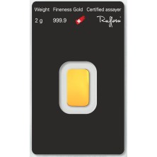 Lingote en formato "Minted Bar" (troquelado/acuñado), sellado en blíster de plástico PET junto con su certificado con número de serie coincidente en ambos.