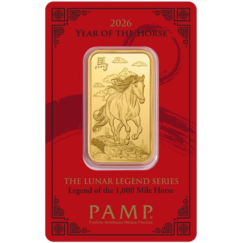 Esta innovadora serie de lingotes de oro y plata no solo celebra cada Año Nuevo Lunar, sino que también nos sumerge en las leyendas fascinantes asociadas con los 12 animales del Zodiaco Chino. En 2026, el Año del Caballo: el Caballo de las Mil Millas es una criatura mítica del folclore clásico chino, capaz de recorrer mil li, o aproximadamente un tercio de milla, en un solo día. Este increíble caballo era demasiado veloz para ser montado por nadie más que Bo Le, un famoso experto. ¡El Caballo de las Mil Millas está plasmado en 1 oz de oro puro! Símbolo de perseverancia y poder mítico, es una llamativa incorporación a la colección de cualquier coleccionista. Presentado en una llamativa tarjeta de certificación CertiPAMP acompañada de una funda de regalo, cada lingote está serializado individualmente. Tercera emisión de la serie Leyendas Lunares.
