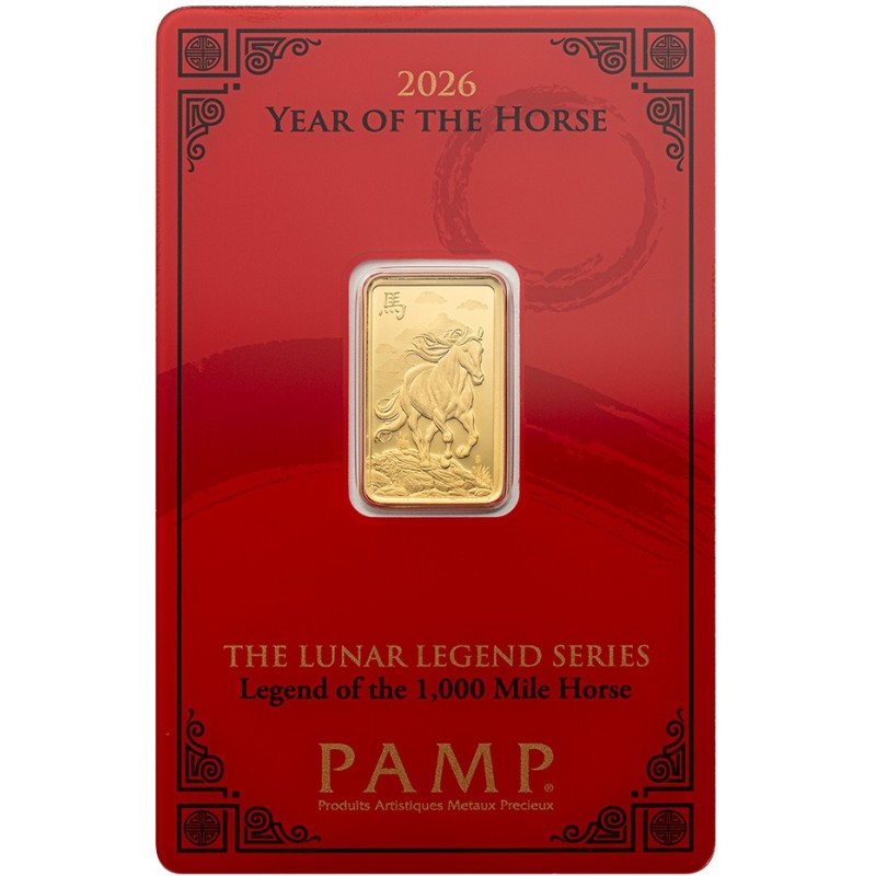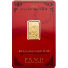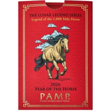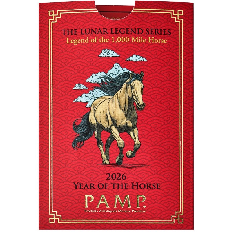 Esta innovadora serie de lingotes de oro y plata no solo celebra cada Año Nuevo Lunar, sino que también nos sumerge en las leyendas fascinantes asociadas con los 12 animales del Zodiaco Chino. En 2026, el Año del Caballo: el Caballo de las Mil Millas es una criatura mítica del folclore clásico chino, capaz de recorrer mil li, o aproximadamente un tercio de milla, en un solo día. Este increíble caballo era demasiado veloz para ser montado por nadie más que Bo Le, un famoso experto. ¡El Caballo de las Mil Millas está plasmado en 1 oz de oro puro! Símbolo de perseverancia y poder mítico, es una llamativa incorporación a la colección de cualquier coleccionista. Presentado en una llamativa tarjeta de certificación CertiPAMP acompañada de una funda de regalo, cada lingote está serializado individualmente. Tercera emisión de la serie Leyendas Lunares.