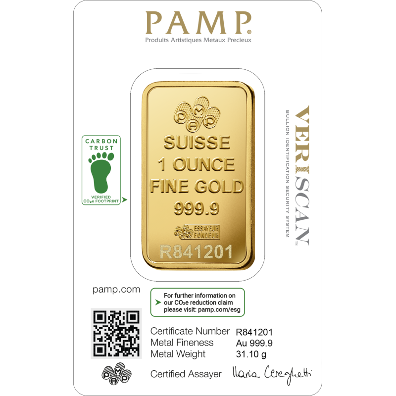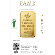 El diseño de lingote más prestigioso y reconocido del mundo, acreditado en Suiza. Cada pieza viene sellada en su empaque de seguridad CertiPAMP™ con un certificado que garantiza su peso y pureza. Es el primer lingote de su clase con la certificación de "Huella de Carbono Reducida" por Carbon Trust. (SKUs: ZAUFS00606, ZAUFS00610).