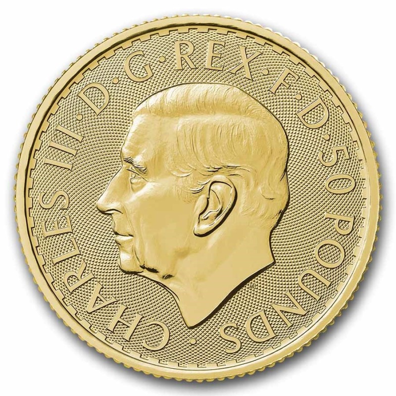 Moneda bullion de oro oficial del Reino Unido "Britannia" con el busto del Rey Carlos III.