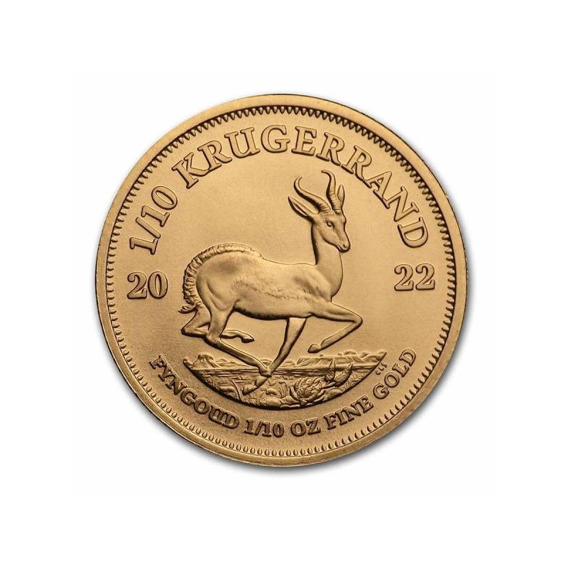 Edición de un décimo de onza de la moneda bullion (lingote amonedado) oficial de Sudáfrica acuñada por primera vez el 3 de julio de 1967. Pionera en el mercado de las monedas bullion se han acuñado más de 50 millones de Krugerrand en todos los tamaños desde el comienzo de su producción.